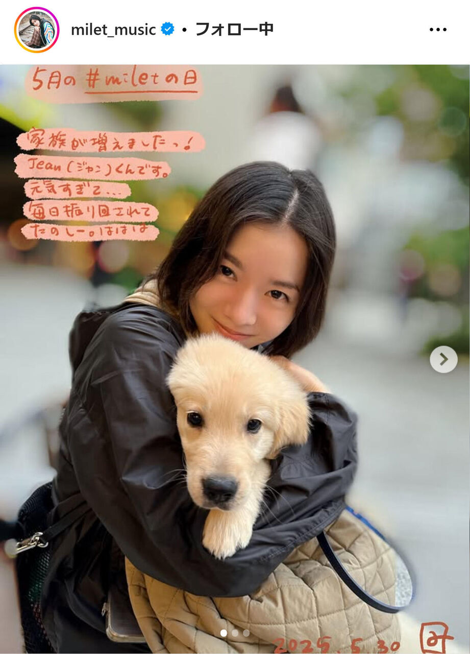 miletは「5月の#miletの日 お久しぶり。家族が増えました」と家族が増えたとし「そのおかげで私も楽しいと感じたり元気な日が増えました。Jean(ジャン)くんです。子犬が大きくなる速度はやすぎ!」と愛犬とのツーショットを添えた。