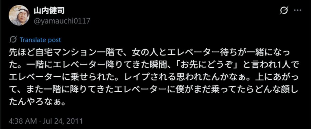 「投稿の内容は、深夜に自宅マンション1階で女性と一緒になるも、到着したエレベーターに女性が乗らず、《お先にどうぞ》と譲られたので一人で乗った、というエピソードです。山内さんは、《レイプされる思われたんかなぁ》と譲った女性の気持ちを推し量った上で、《上にあがって、また一階に降りてきたエレベーターに僕がまだ乗ってたらどんな顔したんやろなぁ》とも付け加えました。じつは投稿した当時も、そこそこの炎上状態になっていました」(スポーツ紙記者)