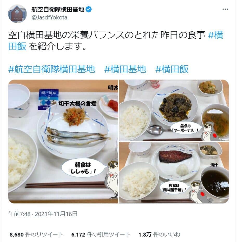 同基地渉外室によると、3等空曹は2021年4月23日、本来は1人分しか食べられない朝食を3人分食べ、2人分(480円相当)を不正に喫食した。同僚隊員の通報で発覚した。