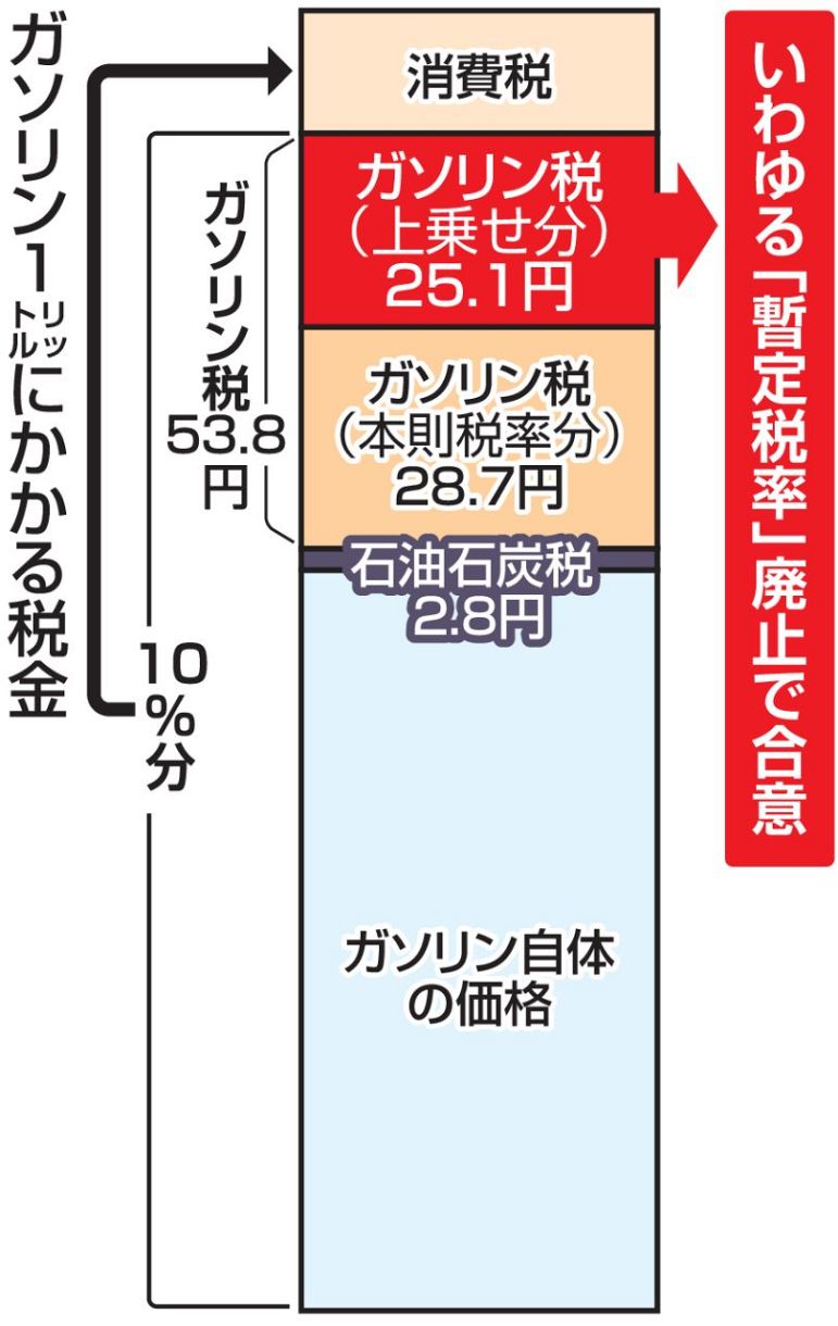 自民、公明、国民民主3党が11日、ガソリン税に上乗せされている暫定税率の廃止で合意した。暫定税率は本来、全国の道路整備の財源不足に対応するために昭和49年に導入され、現在はガソリン1リットルあたり、本来のガソリン税28・7円に加え、25・1円の暫定税率が上乗せ徴収されている。