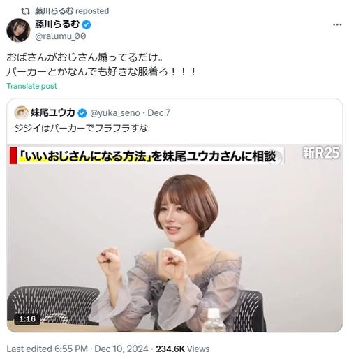コラムニストで脚本家の妹尾ユウカ氏(27)がWEBメディア『新R25チャンネル』で「ジジイはパーカーでフラフラすな」などと主張したことが激しい論争を呼んでいる。