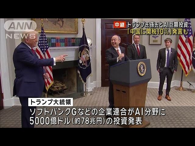 アメリカのトランプ大統領は、ソフトバンクグループや生成AIの開発を手がけるオープンAIなど3社が、アメリカ国内でのAIに関するインフラ整備に今後4年間で日本円にして77兆円を超える巨額の投資を行う計画を明らかにしました。