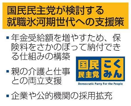 国民民主は、昨年6月に氷河期世代への支援策に関する提言をまとめている。当時の提言をたたき台に、中年を迎えた氷河期世代の年金受給額を増やすため、過去にさかのぼって保険料を納付できる仕組みや、親の介護と仕事の両立支援などを検討する方向だ。