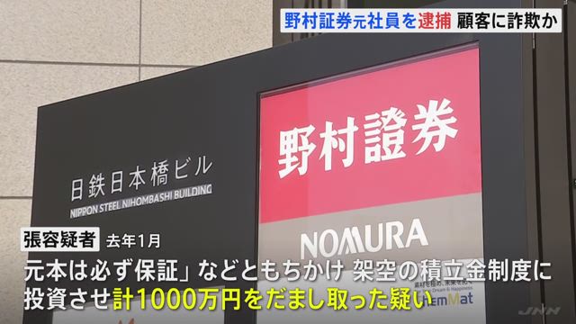 大手証券会社・野村証券で、“超富裕層”とされる顧客の担当だった元社員が、顧客の女性から架空の積み立て金制度への投資名目であわせて1000万円をだまし取った疑いで警視庁に逮捕されました。