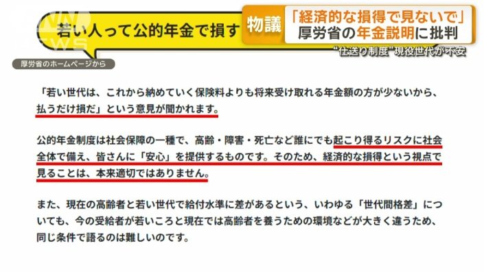 | 「経済的な損得で見ないで」厚労省の年金説明に批判 “仕送り制度”現役世代が不安(テレビ朝日系(ANN)) - Yahoo!ニュース 「経済的な損得で見ないで」厚労省の年金説明に批判 “仕送り制度”現役世代が不安(テレビ朝日系(ANN)) Yahoo!ニュース (出典:Yahoo!ニュース) |